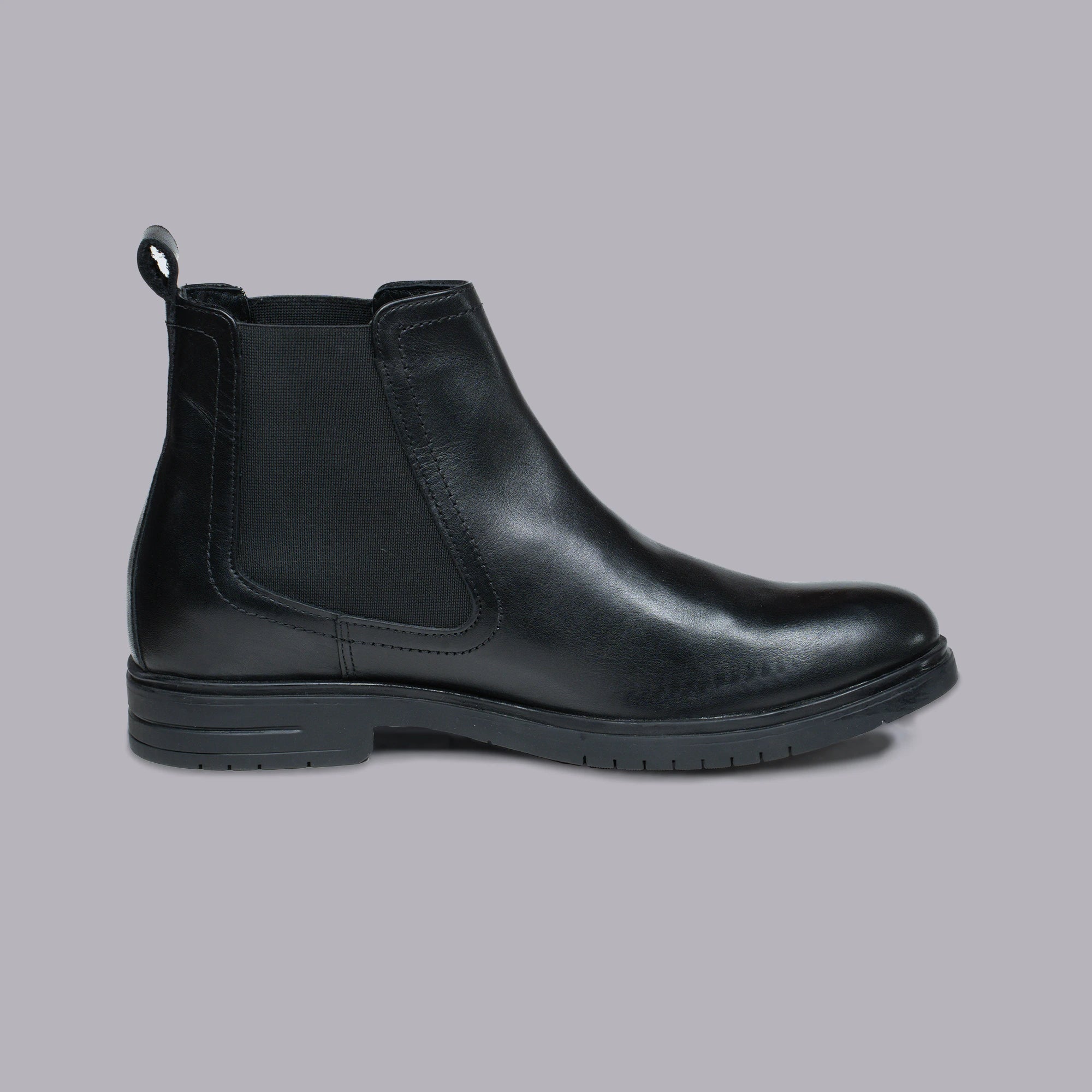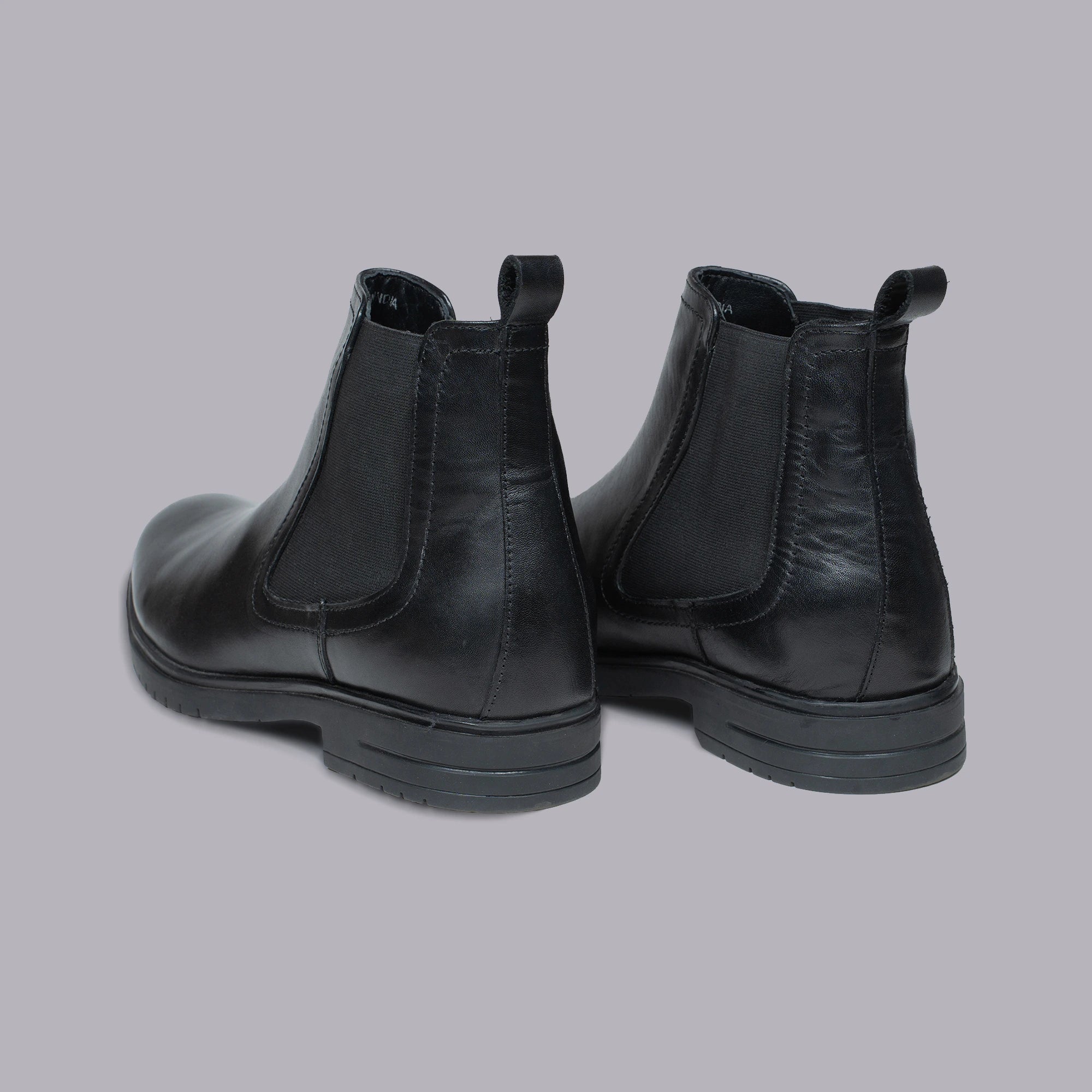 High-ankle design made with smooth leather upper. Elastic side gussets for easy slip-on access. Pull-tabs on the back for added convenience. Tapered ankle fit for structured appearance. Slightly squared toe with clean vamp finish. Lined interior with breathable, padded fabric. Thick rubber sole with deep grip treads for traction. Heel is moderately raised for improved posture. Stitching around the sole adds durability. Designed for moderate weather and transitional seasons.