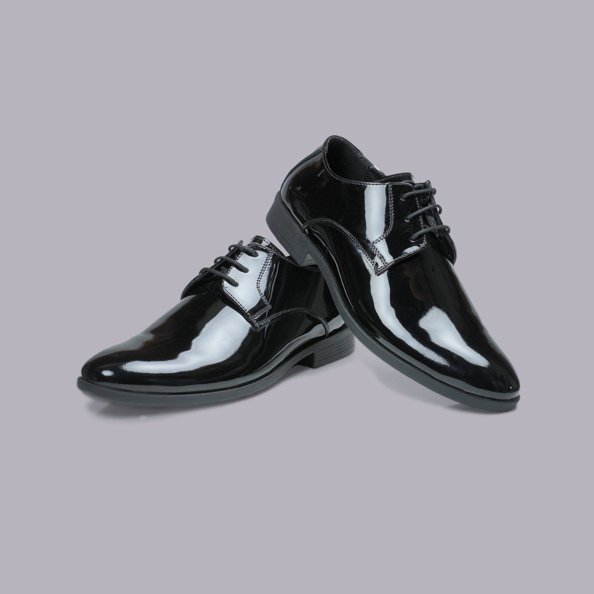 Patent leather upper with a high-gloss finish. Traditional lace-up closure with thin round laces. Sleek, elongated silhouette with a closed lacing system. Hard outsole with low heel suitable for formal flooring. Cushioned insole with synthetic lining for comfort. Reinforced toe cap maintains structure and shape. Outsole tread is minimal for smoother glide on flat surfaces. Lightweight construction for ease of motion. Seam detailing is fine and unobtrusive. Best reserved for formal occasions.