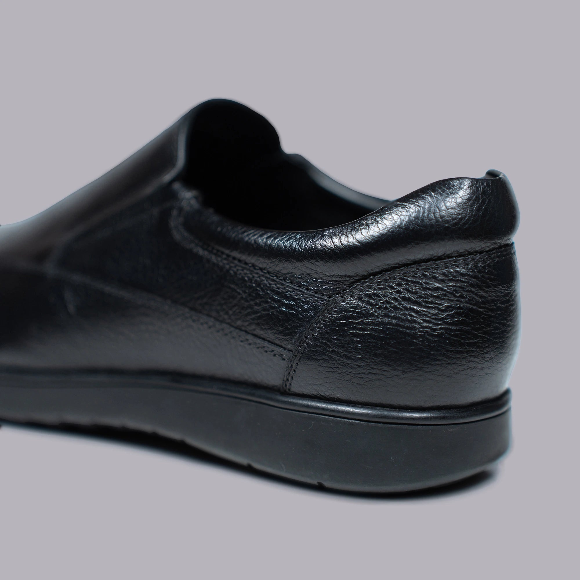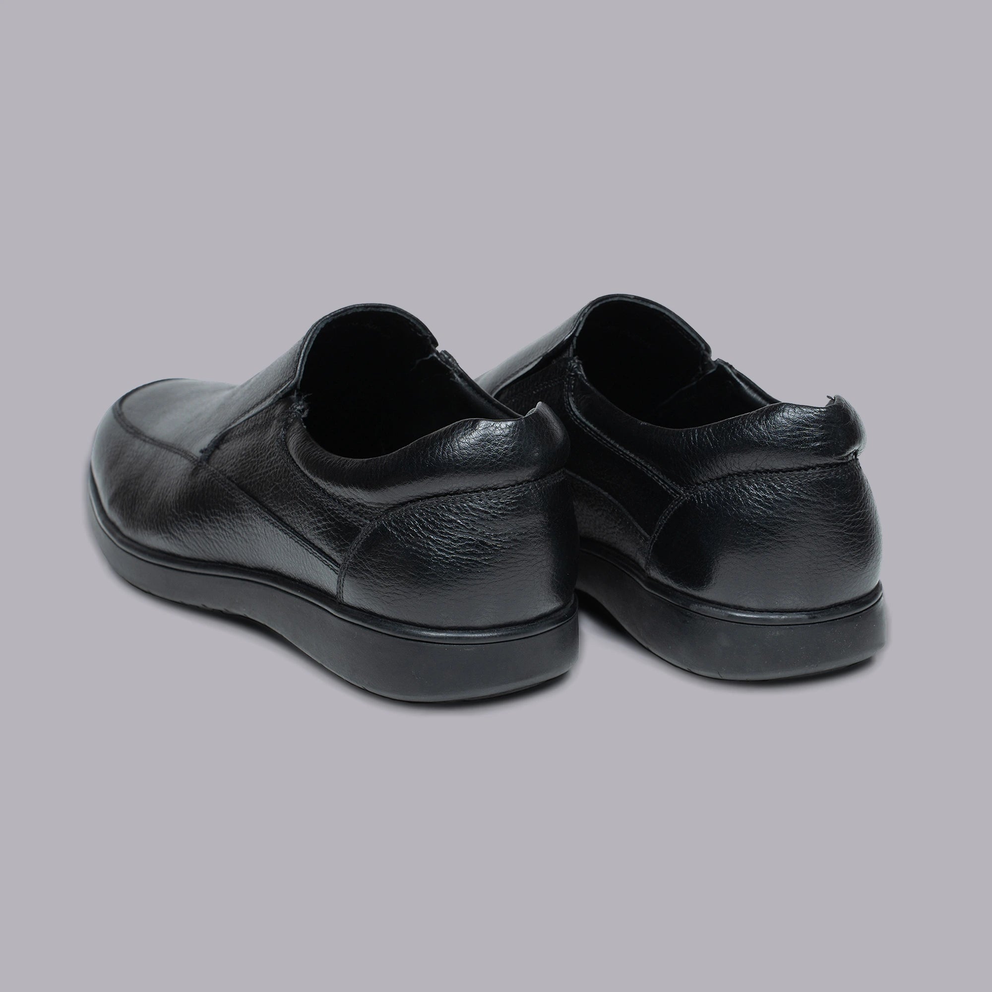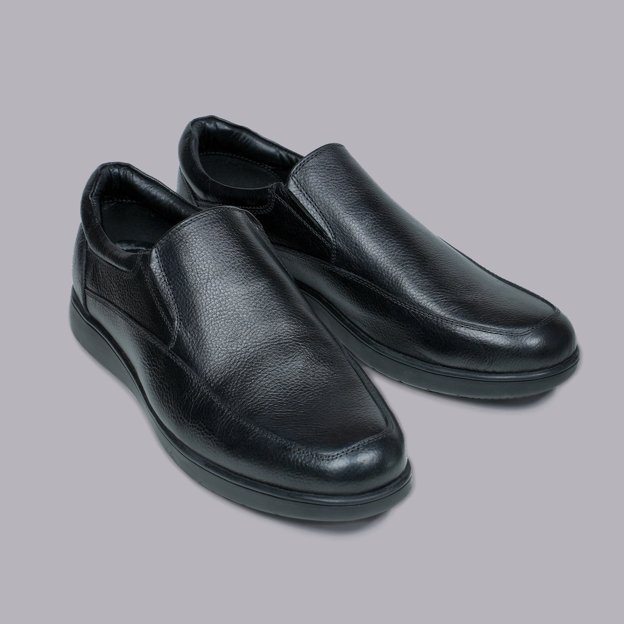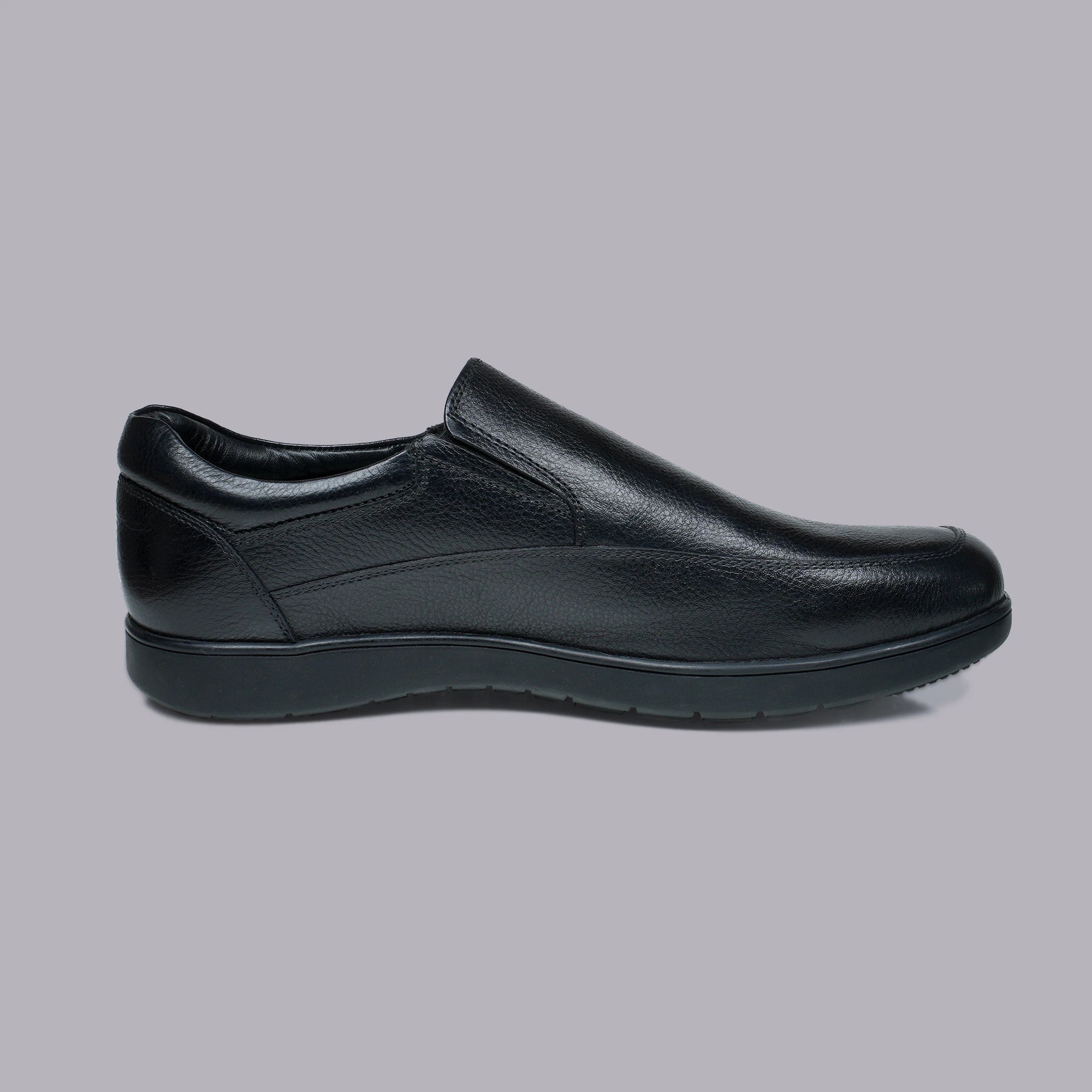 Constructed with matte black leather upper. Low-profile slip-on design for quick wear. Elastic gussets on both sides ensure snug fit. Rounded toe with slightly elevated vamp. Rubber outsole with micro-texture grip pattern. Inner cushioned footbed with arch contour. Textile-lined interior prevents foot sweating. Lightweight and low-flex sole for daily stability. Reinforced stitching at pressure points. Designed for professional or practical environments.